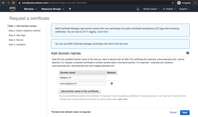 Answer it to earn. See below for an example of how this might be achieved when the domain is hosted in route 53 and managed by terraform. From the aws region selector in the navigation bar select the region that your domain is in.